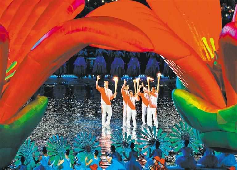 11月9日晚,十五運會開幕式上,優(yōu)秀運動員代表手持采自南海1522米深處的圣火,站在水舞臺中央,向觀眾揮手致意。
