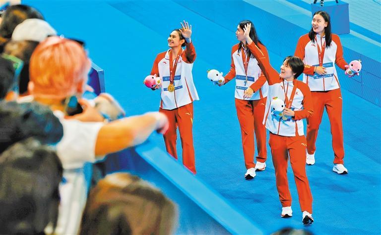 11月10日,十五運會女子4×100米自由泳接力決賽頒獎儀式后,奪冠的山東隊向現(xiàn)場觀眾致意。