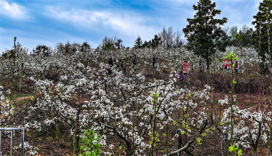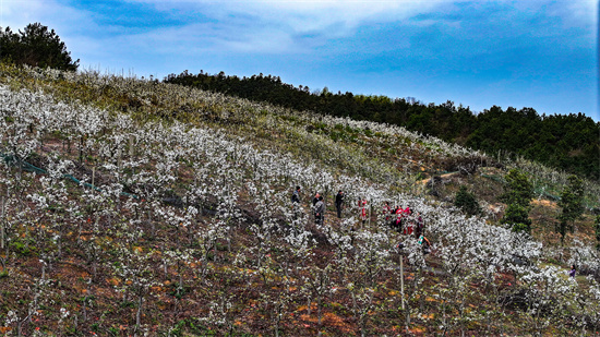 2025年3月23日,春和景明,安徽省合肥市廬江縣冶父山鎮(zhèn)幸福村三山果園的1000多畝梨樹花開雪白,將山嶺掛滿霜雪,蔚為壯觀,吸引了游客來到梨園欣賞花開、拍照留念。