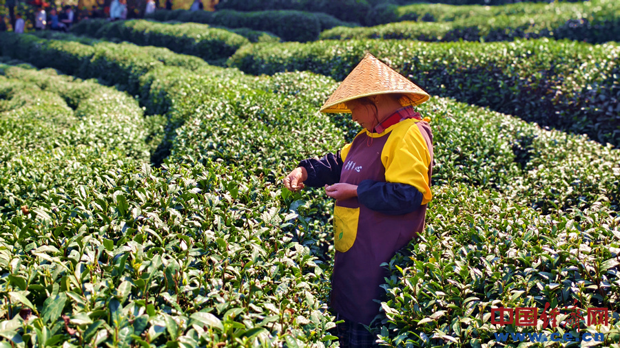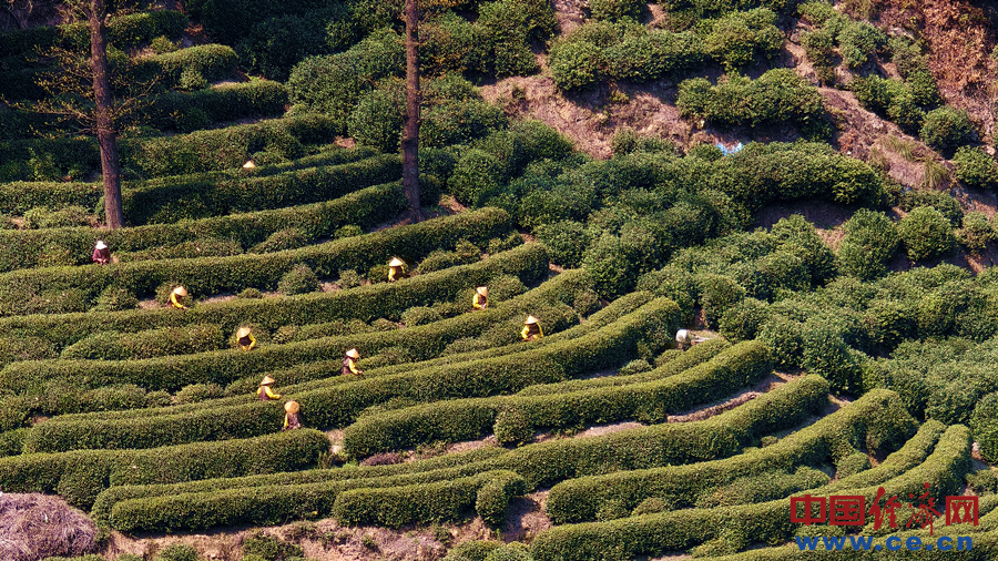 3月22日,采茶工身著采茶服,頭戴斗笠,穿梭在茶田中。中國經(jīng)濟網(wǎng)記者高原 攝
