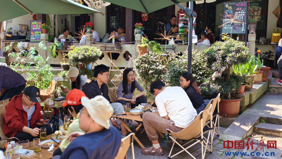 龍井村內(nèi),游客絡繹不絕。茶農(nóng)自營茶館,供游客品茶,提供餐飲、住宿等。中國經(jīng)濟網(wǎng)記者高原 攝