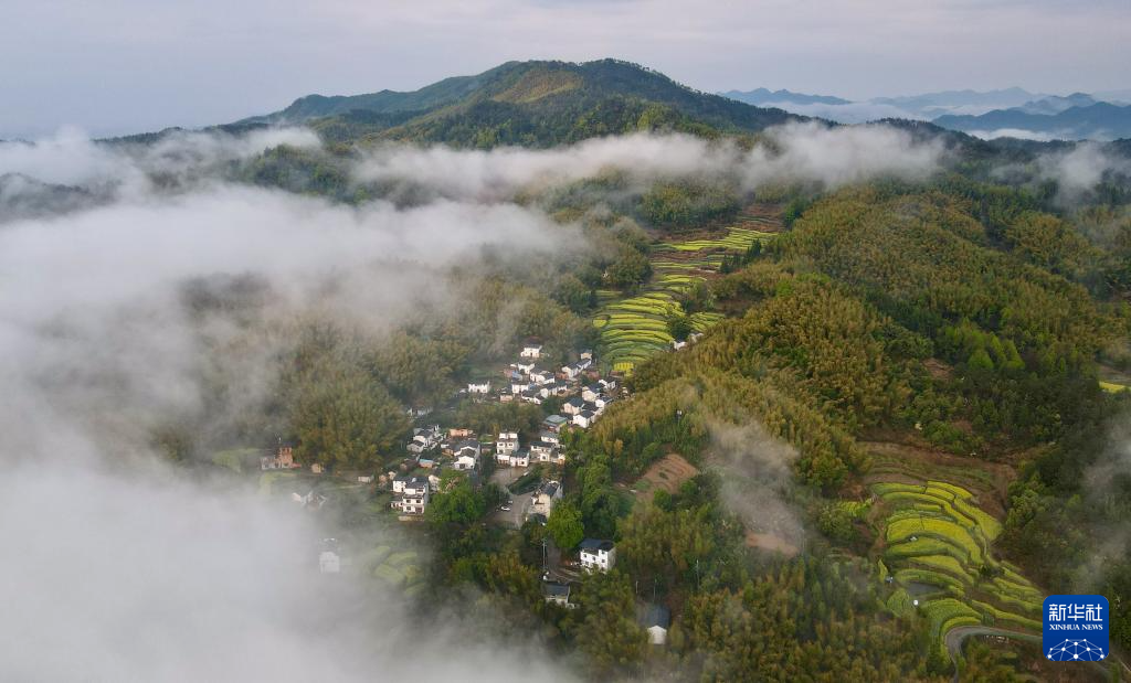 雨后初霽,位于安徽省黃山市徽州區(qū)呈坎鎮(zhèn)的靈山村出現云海景觀,縹緲的云霧與徽派民居、梯田花海相映成趣,美不勝收。