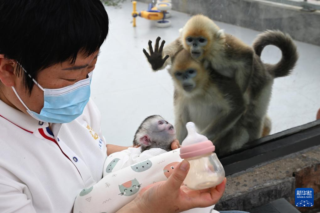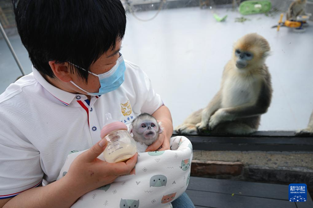4月8日,工作人員在河南省商丘動物園給川金絲猴幼崽喂奶。