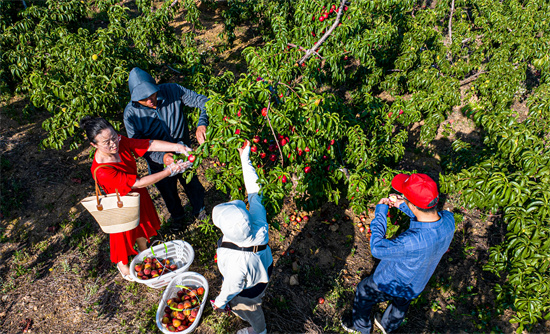 2025年6月5日,芒種至,標(biāo)志著初夏結(jié)束,盛夏啟章。在安徽省合肥市廬江縣冶父山鎮(zhèn)明圣村建大果園種植家庭農(nóng)場(chǎng),游客正在體驗(yàn)黃桃采摘游的樂(lè)趣。