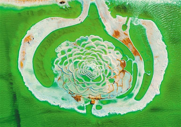 4月24日,位于青海省海西蒙古族藏族自治州格爾木市的察爾汗鹽湖,巨型鹽花“綻放”湖中,空中俯瞰,頗為壯觀。