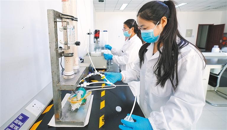 4月20日,青海鹽湖藍(lán)科鋰業(yè)股份有限公司吸附劑車間,化驗(yàn)員在測(cè)試吸附劑吸附能力。