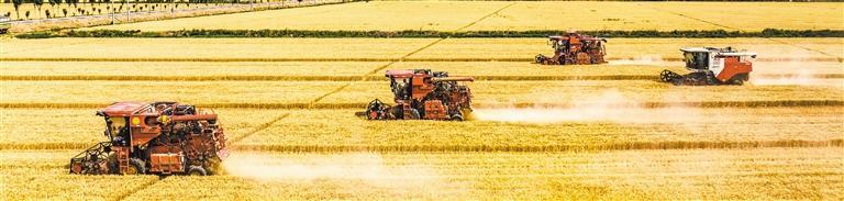 6月6日,山西省永濟市紅日農(nóng)業(yè)虞鄉(xiāng)農(nóng)場基地,農(nóng)戶駕駛大型收割機加緊收割小麥,確保顆粒歸倉。薛 俊攝(中經(jīng)視覺)