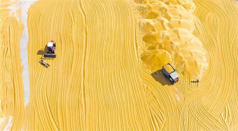 6月6日,江蘇省宿遷市屠園鎮(zhèn)一家庭農(nóng)場,村民駕駛拖拉機在曬場翻曬小麥。徐 瑞攝(中經(jīng)視覺)