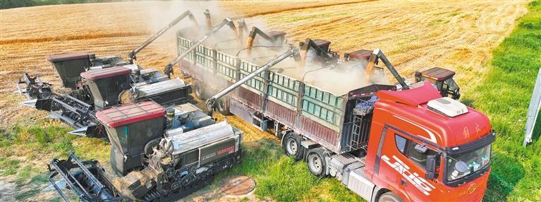 5月29日,在安徽省合肥市蜀山區(qū)小廟鎮(zhèn),農(nóng)機手駕駛收割機卸糧。陳三虎攝(中經(jīng)視覺)