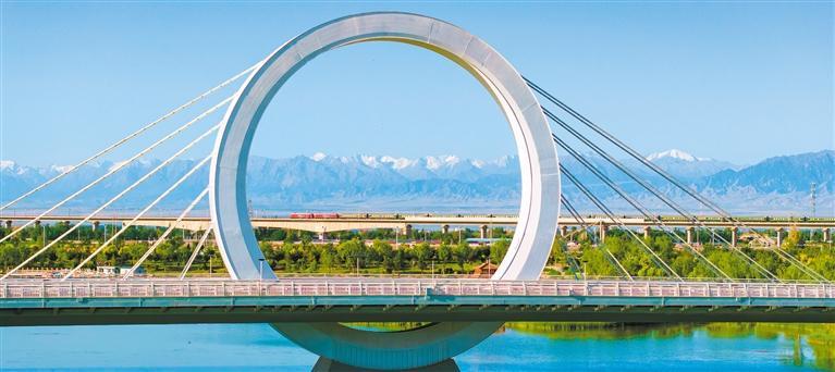 6月10日,甘肅省張掖市甘州區(qū)皓月大橋與祁連山脈和鐵路列車構(gòu)成一幅和美畫卷,吸引游客前來打卡。楊永偉攝(中經(jīng)視覺)