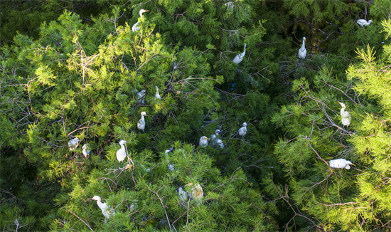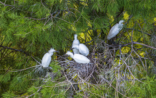2025年6月17日,在安徽省合肥市廬江縣柯坦鎮(zhèn)城池村大漢塘池杉林中,成千上萬(wàn)只牛背鷺、白鷺、蒼鷺等多種夏季候鳥(niǎo)在此棲息,聰明的它們藏身樹(shù)蔭避暑,筑巢、孵育度盛夏。