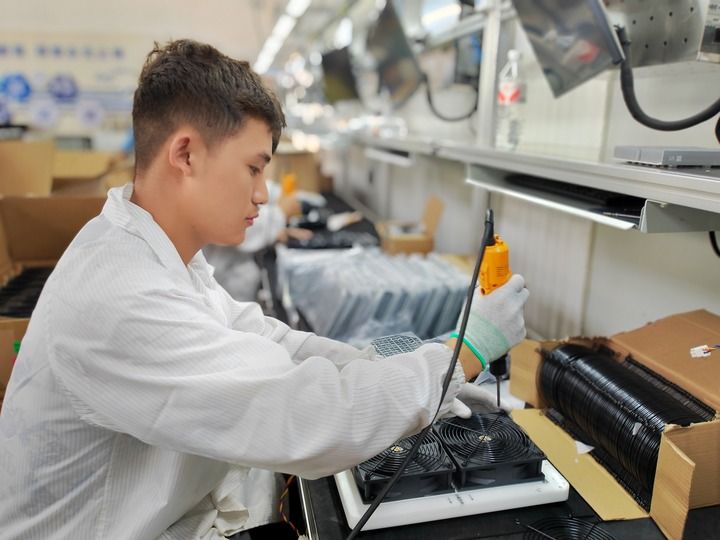 2025年5月16日,閩寧鎮(zhèn)閩寧產(chǎn)業(yè)園,星漢智能科技(寧夏)有限公司的工人正在生產(chǎn)線上組裝產(chǎn)品。新華每日電訊記者任瑋 攝