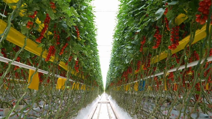 凱盛(銀川)現(xiàn)代智慧農(nóng)業(yè)科技有限公司,在閩寧鎮(zhèn)打造的智慧農(nóng)業(yè)產(chǎn)業(yè)園玻璃溫室里,種植番茄。(永寧縣委宣傳部供圖)