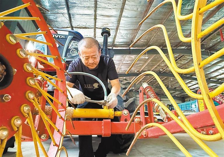 7月9日,梨樹縣盧偉農(nóng)機(jī)農(nóng)民專業(yè)合作社,農(nóng)機(jī)手在檢修農(nóng)機(jī)設(shè)備。為實(shí)現(xiàn)良種良法配套、農(nóng)機(jī)農(nóng)藝結(jié)合,當(dāng)?shù)夭粩啻蛟?ldquo;梨樹模式”的適配利器。