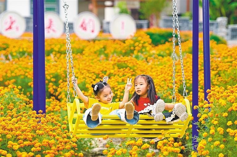10月12日,小朋友在重慶市酉陽(yáng)土家族苗族自治縣銅鼓鎮(zhèn)興隆村萬壽菊花海中游玩。