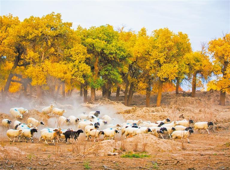 10月13日,內(nèi)蒙古自治區(qū)阿拉善盟額濟(jì)納旗達(dá)來呼布鎮(zhèn),羊群在胡楊林中覓食。