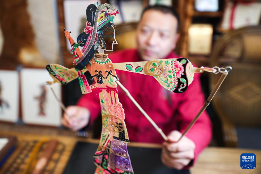 1月8日,在慶陽(yáng)市環(huán)縣環(huán)州故城皮影館,環(huán)縣道情皮影非遺傳承人張治文檢查白素貞影件的靈活度。