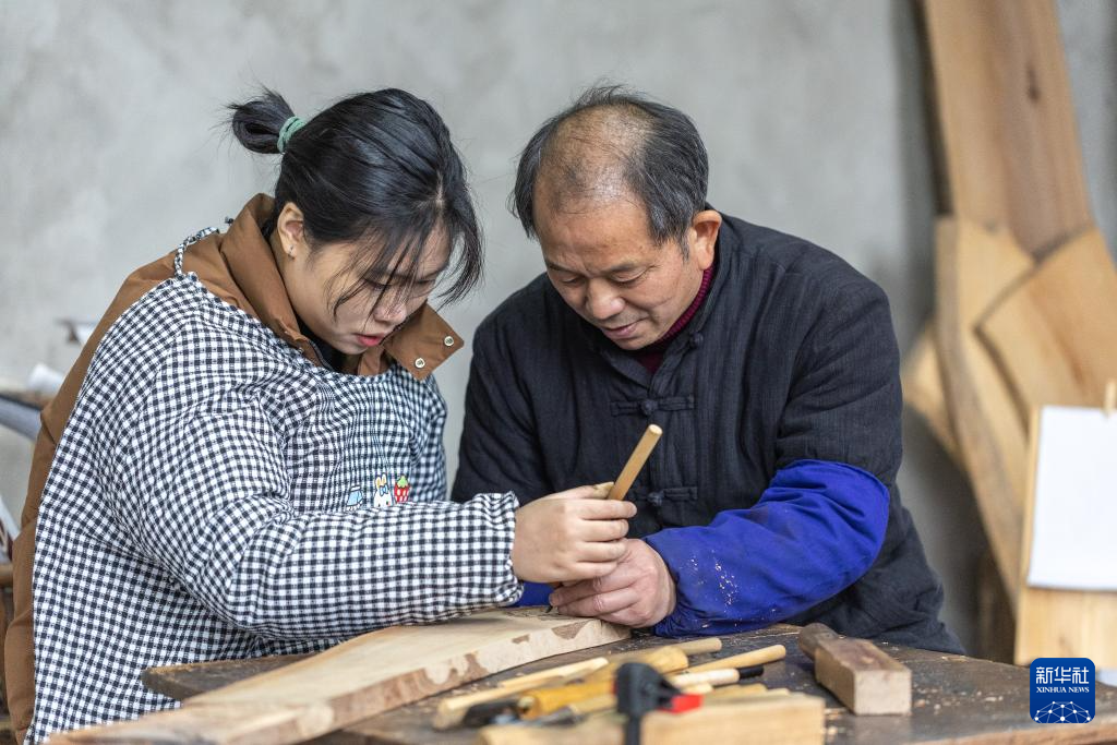 1月14日,在重慶市梁平區(qū)屏錦鎮(zhèn),梁平木版年畫國家級代表性傳承人徐家輝(右)指導(dǎo)學(xué)生熊彩汝梁平木版年畫技藝。