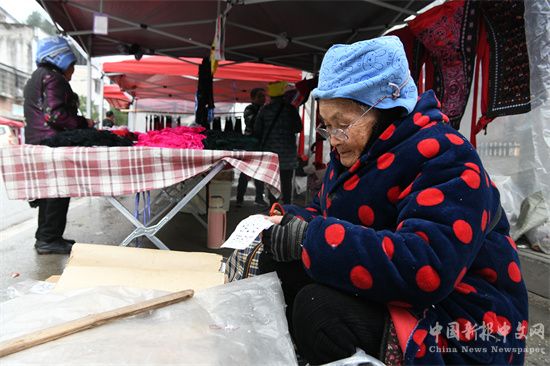 2025年1月25日,苗族老人在貴州省凱里市凱棠鎮(zhèn)趕場(chǎng)賣剪紙。(楊仁海 攝)