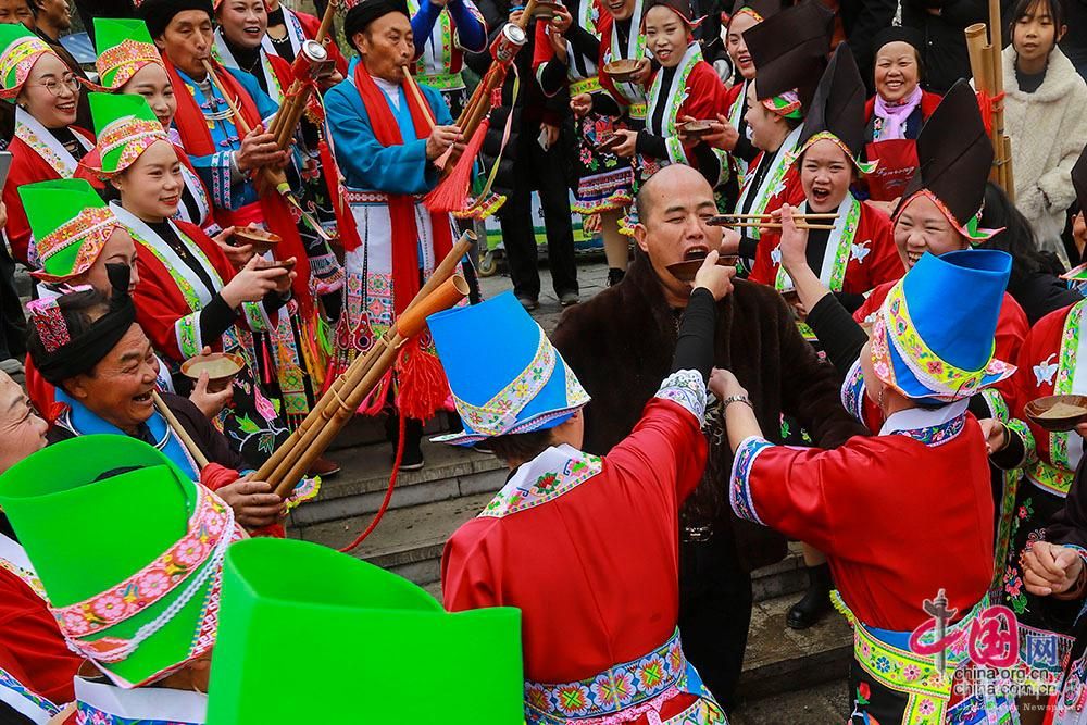 2月3日,苗族同胞在貴州省安順市西秀區(qū)舊州鎮(zhèn)碧波廣場跳花節(jié)上與觀眾互動。
