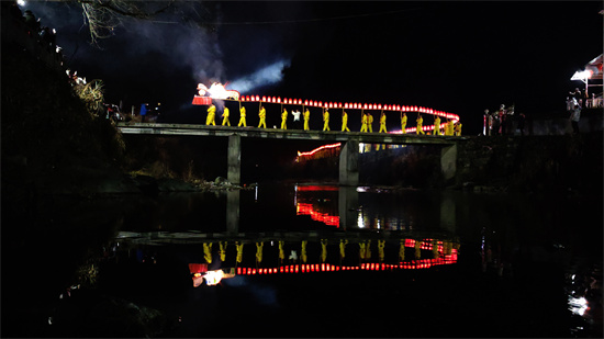 在歡快熱烈的的鑼鼓聲中,村民扛起板凳龍在村中穿行。這條長達百米的巨龍,由一塊塊板凳拼接而成。每塊板凳上都安放著4盞紅燈籠,燈籠內(nèi)放置蠟燭。在夜色的映襯下,板凳龍通體紅亮,格外耀眼奪目。舞板凳龍是當(dāng)?shù)卮迕襁^年的傳統(tǒng)習(xí)俗,也是最熱烈喜慶的活動。這時候,家家戶戶、男女老少都走出家門,觀看舞龍的盛況,歡聲笑語不斷,一片喜氣洋洋的熱鬧景象。
