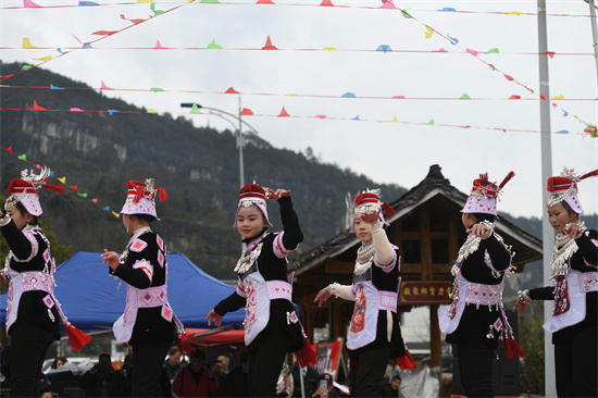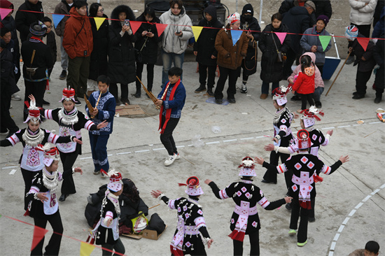 2025年2月7日,貴州省凱里市大風(fēng)洞鎮(zhèn)老君寨村,亻革家姑娘們?cè)诖汗?jié)蘆笙會(huì)展演蘆笙舞。(楊仁海 攝)