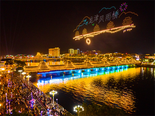 民族文藝演出的舞美設(shè)計暗藏巧思,固若金湯的“長城”環(huán)抱太和塔?!逗推街s·光啟芷江》點亮儀式環(huán)節(jié)更是一大亮點。民族文藝演出的節(jié)目創(chuàng)排則以時空對話、多元藝術(shù)形式融合為主要特色:大型音詩畫表演《砥柱湖湘》通過朗誦、影像與情境舞蹈的深度融合,再現(xiàn)湖湘兒女堅守信仰、踐行使命的精神內(nèi)核;大型光影詩舞表演《屈原的樹》以屈原與芷江楊溪云樹的精神聯(lián)結(jié)為線索,融合吟唱、舞蹈、戲曲元素與AI視覺影像,打造跨越時空的楚辭意境。音樂情景劇《飛虎·世界》還原中華兒女與國際友人攜手互助的真實往事,生動詮釋跨越國界的深厚友誼;跨時空情景表演《芷江,向海而生!》則以三個層層遞進的篇章——沈從文與芷江的文化聯(lián)結(jié)、歲月里龍津橋的堅守、芷江對接國際發(fā)展的嶄新面貌,串聯(lián)起芷江從內(nèi)陸小城到和平新城的發(fā)展歷程。《主題《和平》結(jié)合流行、民族與世界音樂風(fēng)格,用音樂連接世界?!短汀费婊鹚囆g(shù)表演則將焰火表演與音樂深度融合,通過《玉盤》《芷江飛來一支和平歌》《歌唱祖國》三首歌曲的演繹,以光與聲共繪和平愿景。藝術(shù)表達(dá)上,空靈的侗族大歌、悠揚的蘆笙演奏,共同描繪出兼具東方美學(xué)與時代氣息的“和平之美”。