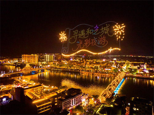 第六屆中國芷江國際和平文化節(jié)開幕式民族文藝演出以芷江和平地標(biāo)太和塔為核心載體,借助前沿光影科技、無人機秀等打造出虛實結(jié)合的立體演出空間,讓觀眾沉浸式感受“和平文化”在芷江這片土地上傳承、生長的脈絡(luò)。