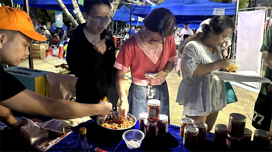 當(dāng)天傍晚,“湘超狂歡 ‘衡’有味道” 珠暉美食集市的煙火氣開始升騰,22戶商家,涵蓋珠暉老字號(hào)、街巷網(wǎng)紅特色小吃依次排開特色攤位,串聯(lián)起美食、農(nóng)副產(chǎn)品,球迷們穿梭在小吃攤前,挑選各自心儀的美食。酒糟冰棒、酒糟花生、鹵豬蹄、涼粉、豆腐腦、糖葫蘆……各家攤位前的小吃琳瑯滿目,吸引了眾多球迷駐足選購。這些美食不僅色香味美,更融入了珠暉當(dāng)?shù)氐莫?dú)特食材和烹飪技藝,展現(xiàn)了珠暉美食的豐富多樣性和文化內(nèi)涵,為球迷觀賽帶來了別樣體驗(yàn)。
