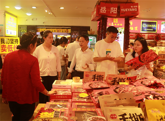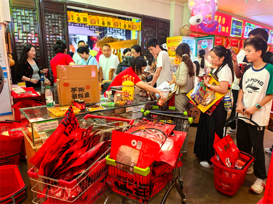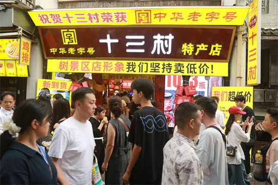同時(shí),岳陽(yáng)城區(qū)商超零售人氣攀升,消費(fèi)購(gòu)物熱情高漲。在岳陽(yáng)樓景區(qū)汴河街中華老字號(hào)“十三村”特產(chǎn)店,人頭攢動(dòng),張燈結(jié)彩,以“湘超”為主題精心布展,“為湘超助力、為岳陽(yáng)加油不加價(jià)”宣傳牌比比皆是,貨架上擺滿了琳瑯滿目的中華老字號(hào)產(chǎn)品,包括香菇醬、手撕醬板魚、醬板鴨等 。