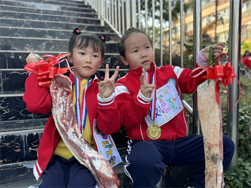 此次比賽獎品很接地氣,生活化,各班前五名分別獎勵一塊五花肉和一板雞蛋,參賽者均可獲得一枚紀(jì)念章并自選一個心儀的紀(jì)念品。