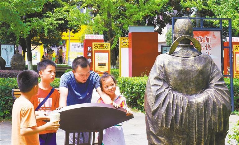 7月28日拍攝的金元社區(qū)法治文化廣場上的人物雕塑、宣傳展板。社區(qū)內(nèi)有法律診所、人民調(diào)解室等機(jī)構(gòu)為居民提供服務(wù)。