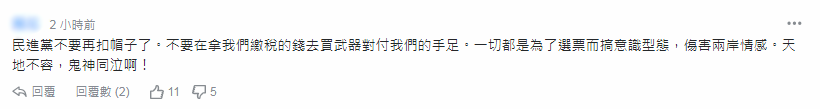 針對綠媒此番做法,有島內(nèi)網(wǎng)友反駁稱:民進黨不要再扣帽子了。不要再拿我們繳稅的錢去買武器對付我們的手足。一切都是為了選票而搞意識型態(tài),傷害兩岸情感。天地不容,鬼神同泣啊!