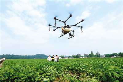 8月13日,無人植保機在四川省青神縣南城鎮(zhèn)百花村毛豆田進行農(nóng)藥噴灑防治病蟲害作業(yè)。張忠蘋攝(人民圖片)