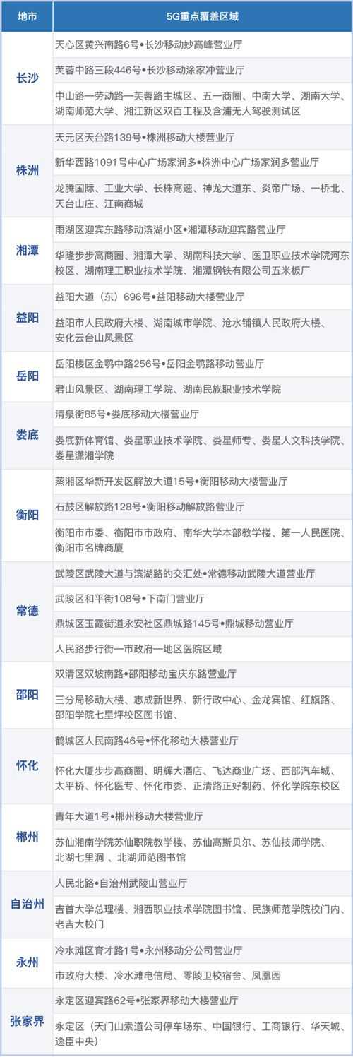 湖南移動(dòng)5G全省已覆蓋的部分區(qū)域:
