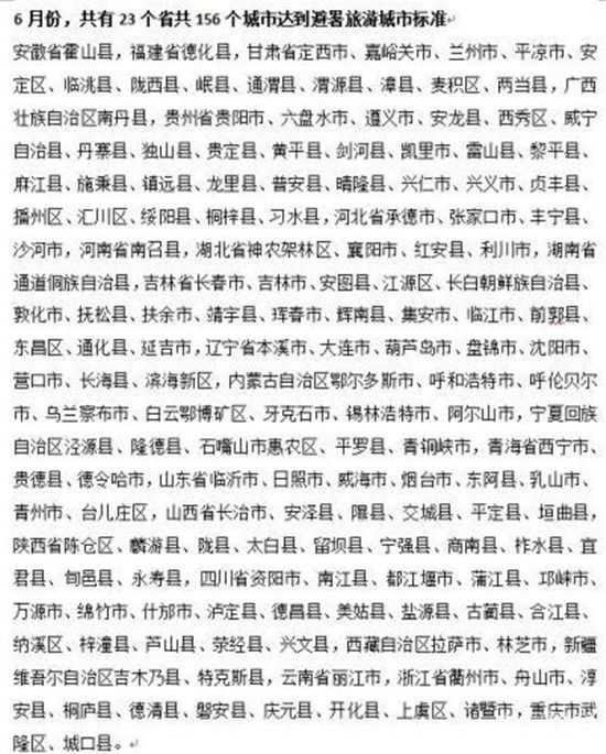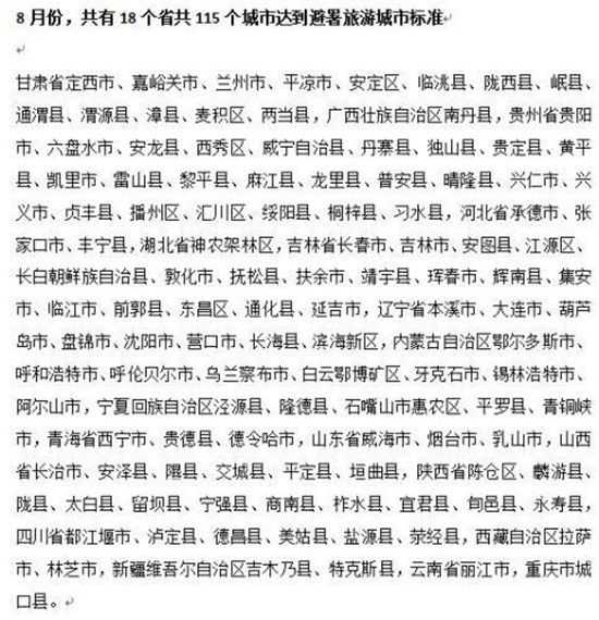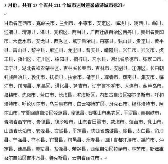 此外,專家組還根據(jù)不同月份評定6月、7月和8月分別達到避暑旅游標準的城市。