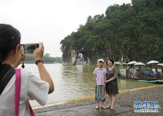 游客在桂林兩江四湖象山景區(qū)與象鼻山合影(7月15日攝)。