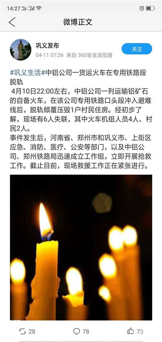 中國新報訊(記者 李志德)4月11日,河南鞏義市微博發(fā)布消息稱:4月10日22時左右,中鋁公司一列運輸鋁礦石的自備火車,在該公司專用鐵路口頭段沖入避難線后,脫軌傾覆壓毀1戶村民住房。經(jīng)初步了解,現(xiàn)場有6人失聯(lián),其中火車機組人員4人、村民2人。