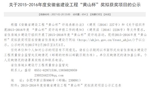 那么,為湖南省第六工程有限公司獲得加分的“黃山杯”獎項是否真正具有加分資格呢?知情人士表示,該“黃山杯”獎項為湖南省第六工程有限公司施工的金地·月伴灣4-19#樓,是2015-2016年度安徽省建設(shè)工程獲獎項目,該獎項于2017年2月20日在安徽省住房和建設(shè)廳官網(wǎng)公示。