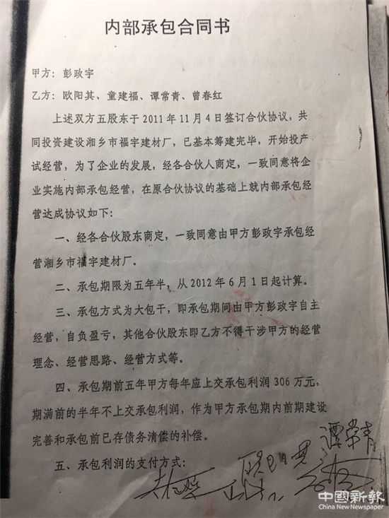 福宇建材廠的股東代表譚常青告訴記者,當(dāng)初合伙建廠,出于信任,經(jīng)幾名股東商量,由彭政宇一人任法人,并辦理了相關(guān)手續(xù),將磚廠建好之后,五合伙人商定由彭政宇以內(nèi)部承包的模式經(jīng)營該廠。承包自2012年6月1日起計(jì)算,承包期限5年半。在《內(nèi)部承包合同書》上協(xié)議,承包期前五年彭政宇每年上交承包利潤306萬元。該協(xié)議還約定:承包期內(nèi),彭政宇不得將本企業(yè)轉(zhuǎn)由他人承包,也不得與他人合伙承包經(jīng)營。9月5日,雙方就承包利潤的支付方式等具體事項(xiàng)簽訂了補(bǔ)充協(xié)議。