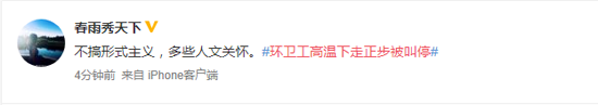 這段視頻隨后引發(fā)網(wǎng)友熱議,有網(wǎng)友認(rèn)為這樣可以磨煉意志,展示環(huán)衛(wèi)工人的良好風(fēng)貌;