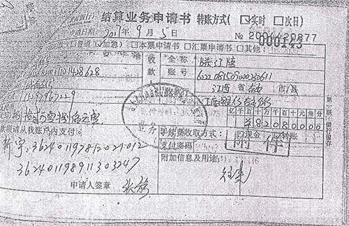 劉新宇向陳江陵個人賬戶轉(zhuǎn)款820800元的申請單。