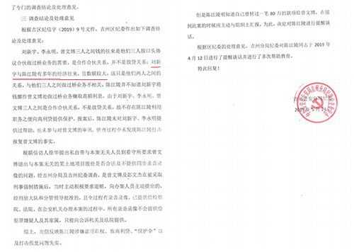 吉安市公安局吉州區(qū)分局紀委對此進行了調(diào)查,2019年5月24日,該紀委向舉報人出具了一份回復,該回復稱,吉州區(qū)紀委對舉報人反映的問題開展了專門的調(diào)查,2019年4月11日,吉州區(qū)紀委就舉報人所反映的問題形成了專門的調(diào)查結(jié)論及處理意見。