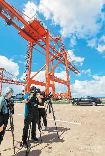 兩岸媒體在欽州鐵路集裝箱中心站拍攝。