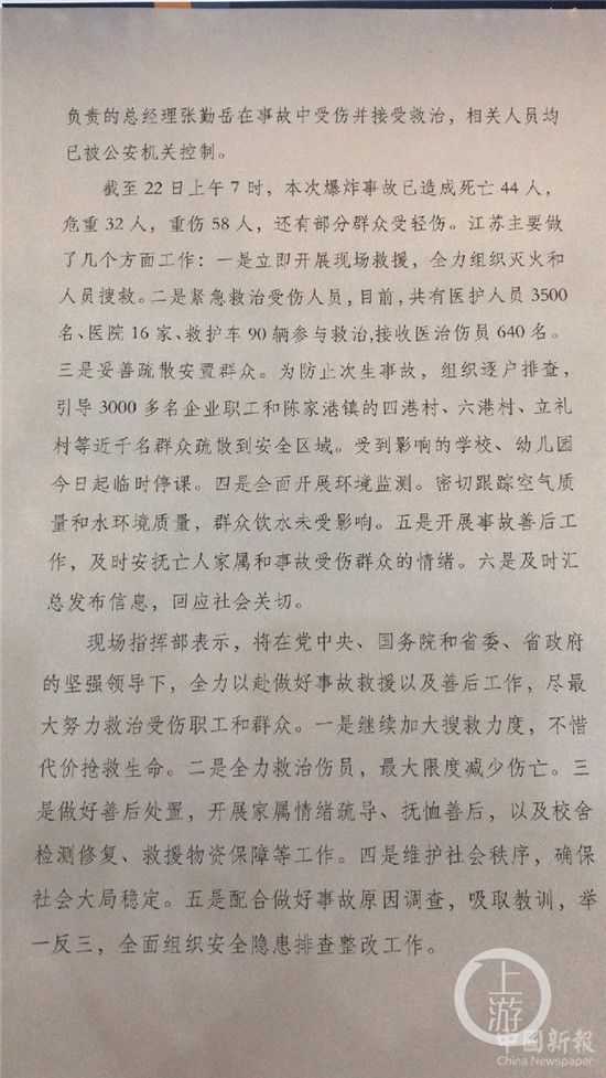 3月22日上午9點,江鹽城市政府在響水縣帝豪大酒店召開爆炸后的第一場新聞發(fā)布會。通報稱:截至22日上午7時,死亡人數(shù)已上升至44人,危重32人,重傷58人。