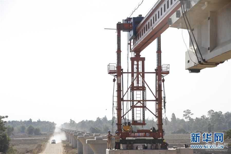 這是2019年2月9日在老撾首都萬象拍攝的楠科內(nèi)河特大橋架梁施工現(xiàn)場。中老鐵路全線最長橋梁楠科內(nèi)河特大橋當(dāng)日開始架梁施工。新華社發(fā)(臧衡攝)
