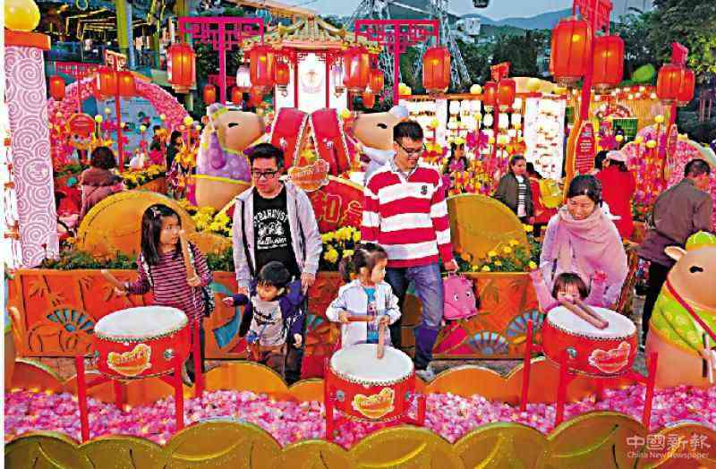 圖:海洋公園新增新春打卡熱點,小朋友在“闔家豚圓”打卡點擂鼓賀新春\中新社