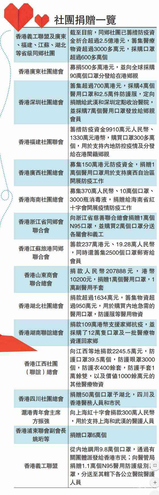 與此同時,港區(qū)全國人大代表、全國政協(xié)委員、港區(qū)省級政協(xié)委員,工商界、僑界、專業(yè)界、宗教界、婦女界等香港各界團(tuán)體、機(jī)構(gòu)和社會人士,踴躍捐贈善款和急需物資。人大代表、政協(xié)委員方面,許家印捐款3億元人民幣,楊國強(qiáng)捐款一億元人民幣,紀(jì)海鵬捐款5000萬元人民幣,周群飛捐款2000萬元人民幣,呂耀東以嘉華集團(tuán)名義捐款2000萬元港幣,李賢義捐款1500萬元人民幣,林龍安設(shè)立1500萬元人民幣抗疫專項(xiàng)基金并捐贈2240個N95口罩和1000套醫(yī)用防護(hù)服,黃朝陽捐款1000萬元港幣,翟美卿旗下香江社會救助基金會捐款1000萬元人民幣設(shè)立醫(yī)護(hù)人員關(guān)愛基金,嚴(yán)彬旗下華彬集團(tuán)捐贈價值1000萬元人民幣的產(chǎn)品,孟麗紅夫婦捐款1000萬人民幣成立抗疫基金,從澳洲采購防疫物資捐贈給廣東番禺,并提供一棟酒店280個房間給南海區(qū)政府防疫備用,鄭翔玲旗下中國生物制藥公司向中國醫(yī)學(xué)科學(xué)院捐款1000萬元人民幣。社會各界方面,李家杰和李家誠以家族名義捐款1000萬元人民幣作為恒基兆業(yè)設(shè)立抗疫基金的啟動資金,新世界中國地產(chǎn)行政主席鄭志剛捐款1000萬元人民幣予中山大學(xué)附屬第一醫(yī)院,恒隆地產(chǎn)撥款1000萬元人民幣成立抗疫基金,九龍倉注資1000萬元人民幣予九龍倉緊急支援基金用以抗疫,太古集團(tuán)向中國紅十字會總會緊急捐款1000萬元人民幣,專項(xiàng)用于抗擊新型肺炎疫情。各省區(qū)政協(xié)委員和同鄉(xiāng)社團(tuán)也積極行動起來,以各種方式大力支援家鄉(xiāng)的抗疫工作。