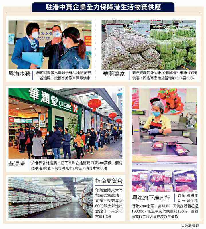 駐港中資企業(yè)全力保障香港生活物資供應(yīng)。中資占香港零售市場(chǎng)的比重雖然不高,但憑藉自身經(jīng)營(yíng)特色為香港市場(chǎng)的保供發(fā)揮了不可或缺的作用。華潤(rùn)堂著力保障衛(wèi)生防護(hù)用品供應(yīng),已下單和在途醫(yī)用口罩400萬(wàn)個(gè)、酒精搓手液3萬(wàn)套、消毒濕紙巾2萬(wàn)包、消毒水3000套;華潤(rùn)萬(wàn)家緊急調(diào)配海外大米10個(gè)貨柜、米粉100噸供港。招商局貨倉(cāng)春節(jié)至今完成近6000噸大米進(jìn)出倉(cāng)操作,高于日常量1倍多;粵海旗下廣南行春節(jié)期間平均一周供港活豬5700多頭,高峰時(shí)一天供應(yīng)活豬超過(guò)1000頭,接近平常供應(yīng)量的150%;粵海水務(wù)春節(jié)期間派出業(yè)務(wù)骨干24小時(shí)值班,并增配一批供水搶修車保障供水。