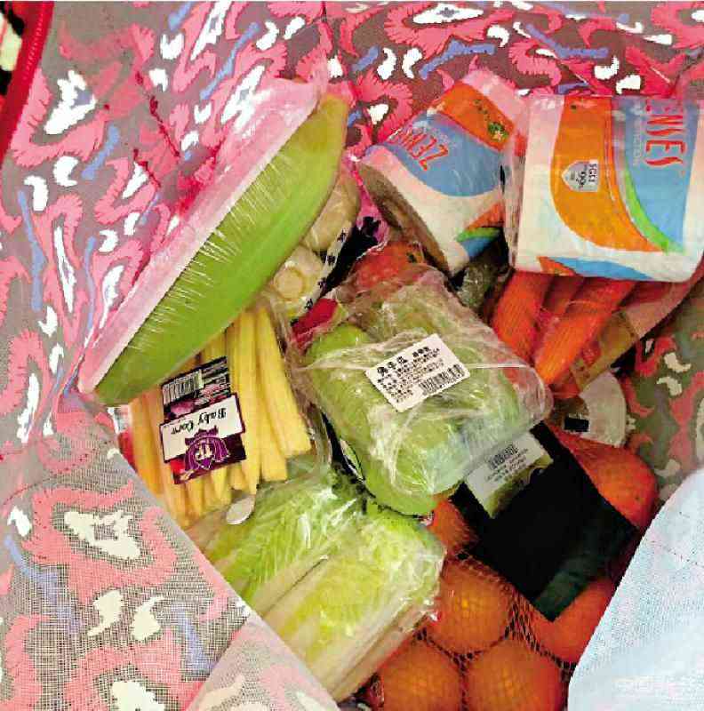 圖:生活物資包括蔬菜、肉、水果、雞蛋、燕麥片、水餃,更有兩卷廁紙